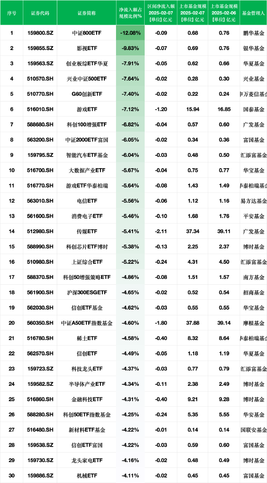 Wind数据暴露,2月7日,鹏华中证800ETF遭净赎回0.09亿元,最新规模0.68亿元,前一日规模为0.76亿元,当日资金净流出额占前一日规模的比例为12.08%。